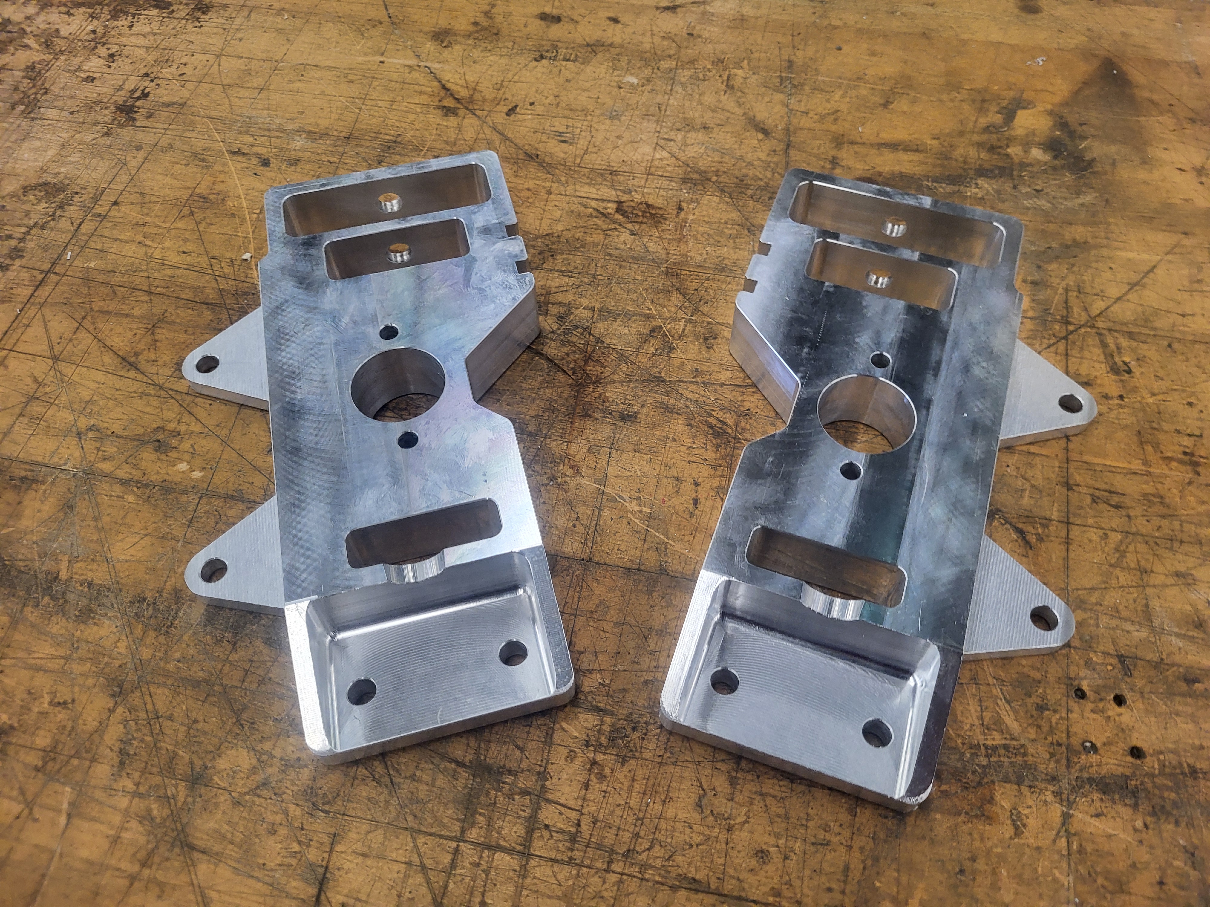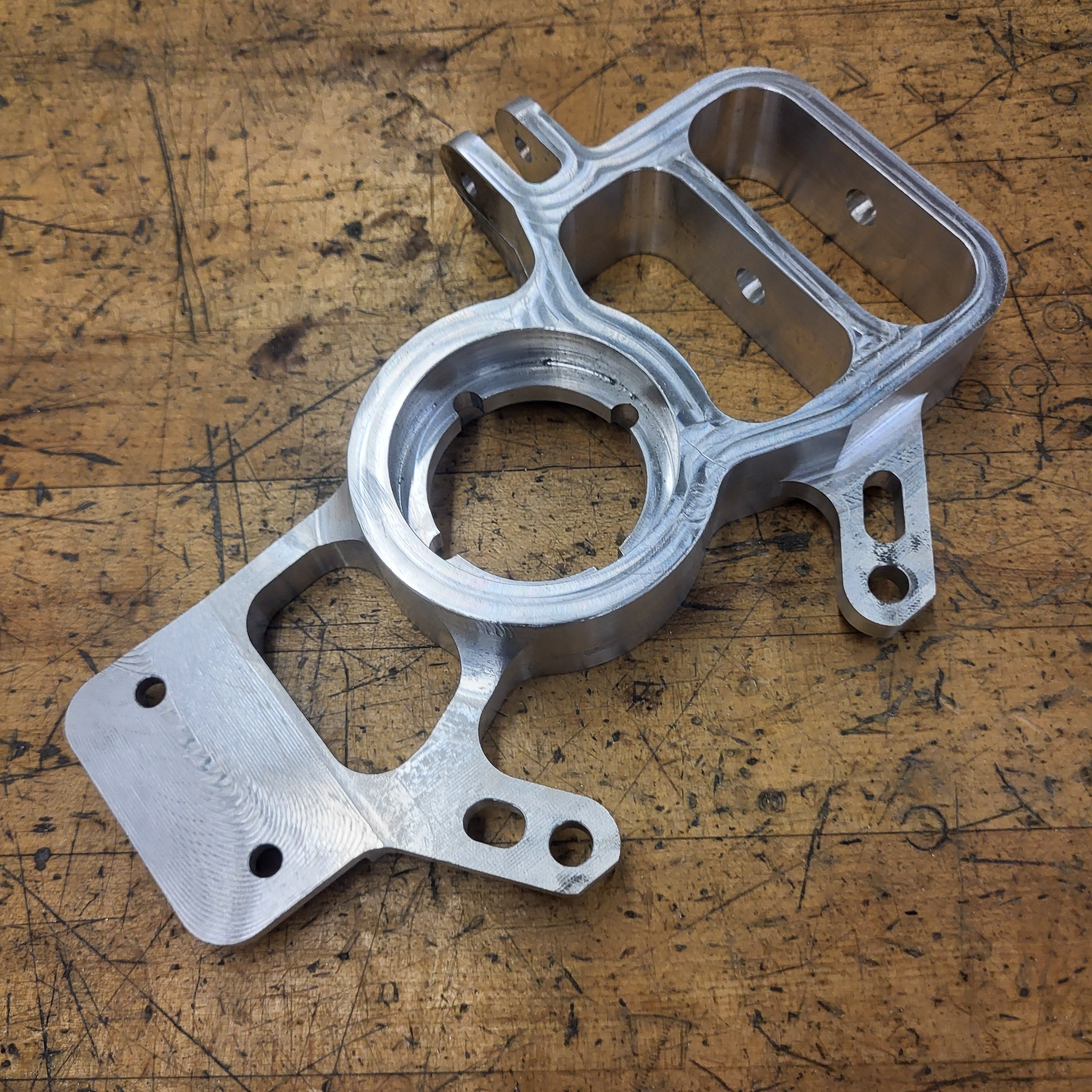 For two years in a row the Formula team had me machine their front uprights. These were apart of the suspension assembly and held the tapered roller bearings for the front wheels. The first year, the parts were much simpler in shape, and due to my lack of experience at the time, we machined the parts in five 3-axis setups each. The second year I had more experience on the machines and we made the parts on our 4th axis in a single setup each.